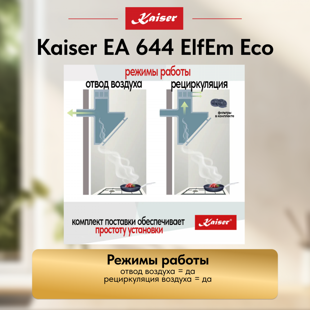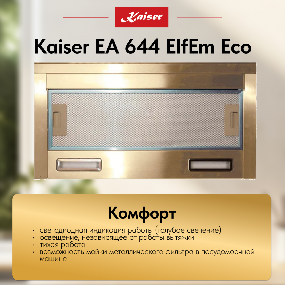 Kaiser EA 644 Eco — выбор тех, кто ищет универсальную, тихую и стильную вытяжку с гибкими возможностями установки. Она сочетает производительность, энергоэффективность и современный дизайн, делая кухню комфортной и уютной.